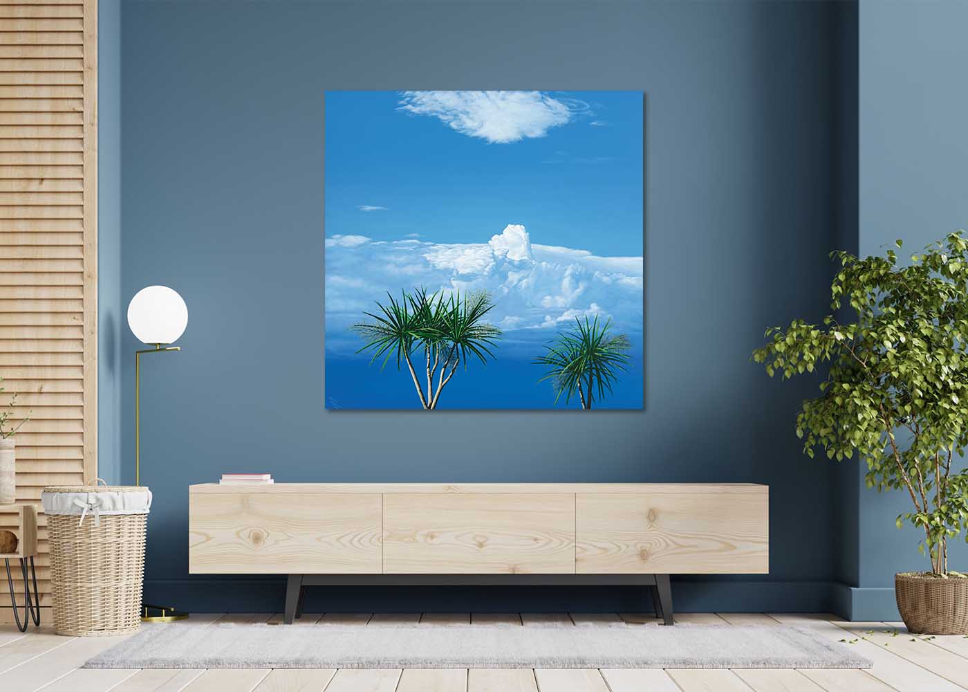 A storm cloud is building in a deep blue sky. In the foreground, the sharply defined shapes of two palms catching a bit of low sun create a stunningly lit contrast to the softness of the shades of the sky beyond.